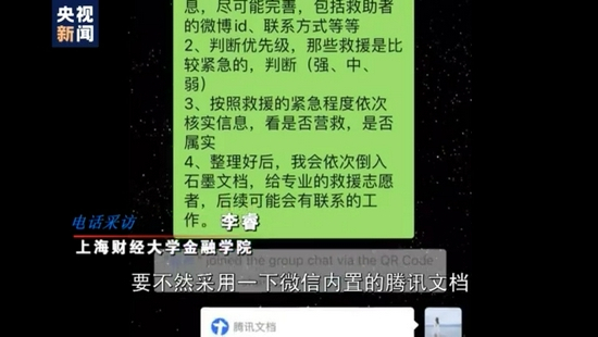 上海财经大学金融学院 李睿:首先来确认哪些被救援了,哪些还没有救援,然后给他分一些紧急程度的优先级,强中弱等等,然后由我们联系被困人员和救援人员给他们做一个对接Excel(表格)的实时性太差了,而且不能大家一起协同编辑。所以当时我就想要不然采用一下微信内置的腾讯文档,当时我想的是后续可能会有更多人用,所以就是所有的(编辑)权限就放开了。