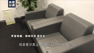 郑州市民 党先生:我被困在公司,晚上只能在这个座椅上或者沙发上稍微眯(休息)一会儿。这是我们买了一些暂时的粮食,一些瓶装水,还有一些能够方便吃的一些食物。