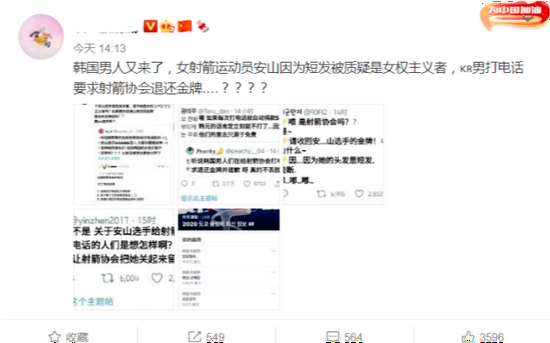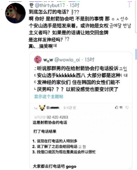 在相关话题下抵制安山也就罢了,没想到这些韩国男网友竟然联合起来向射箭协会投诉,要求安山退还金牌。