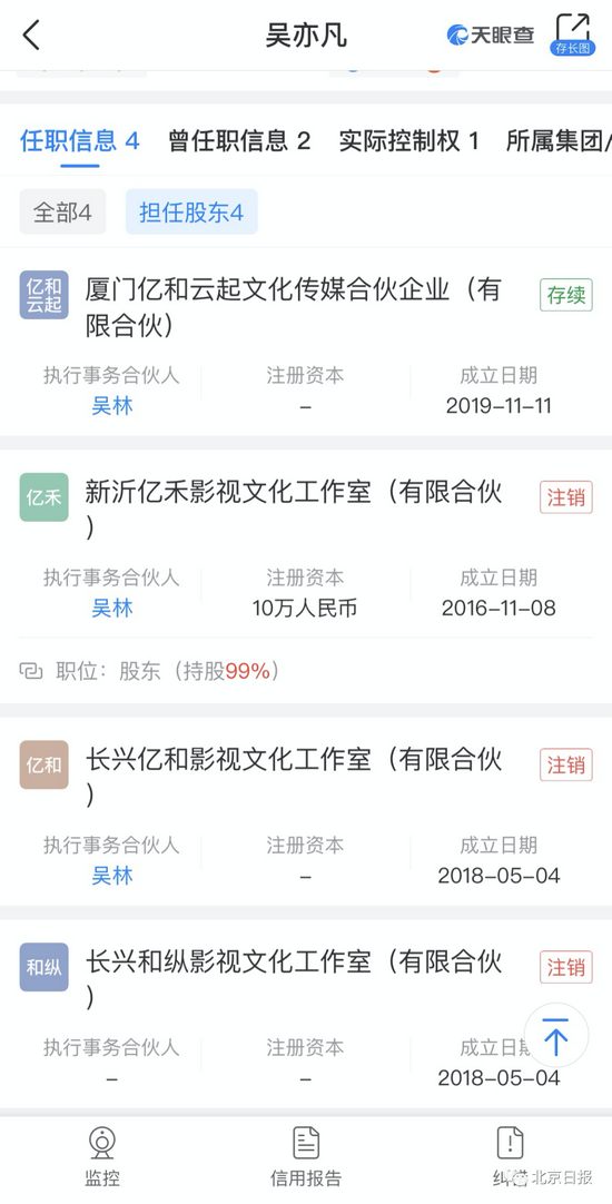 此外,天眼查App显示,目前吴亦凡关联公司仅一家厦门亿和云起文化传媒合伙企业(有限合伙)为存续状态,其余均已注销。 该企业执行事务合伙人为吴林(吴亦凡表哥),吴亦凡持股99.99%,为大股东及最终受益人。