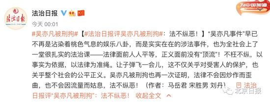 中央政法委机关报@法治日报: “吴亦凡事件”早已不再是沾染着桃色气息的娱乐八卦,而是实实在在的涉法事件,也为全社会上了一堂很扎实的法治课——法律面前人人平等,正义面前没有“顶流”!不枉不纵,以事实为依据,以法律为准绳。让子弹飞一会儿,这不仅关乎对受害人的保护,也关乎整个社会的公平正义。吴亦凡被刑拘也再一次证明,法律不会因炒作而歪曲,也不会因流量而姑息,法不纵恶!
