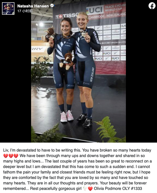 作为Olivia多年的搭档,新西兰奥运选手Natasha Hansen写下了对朋友的悼念。