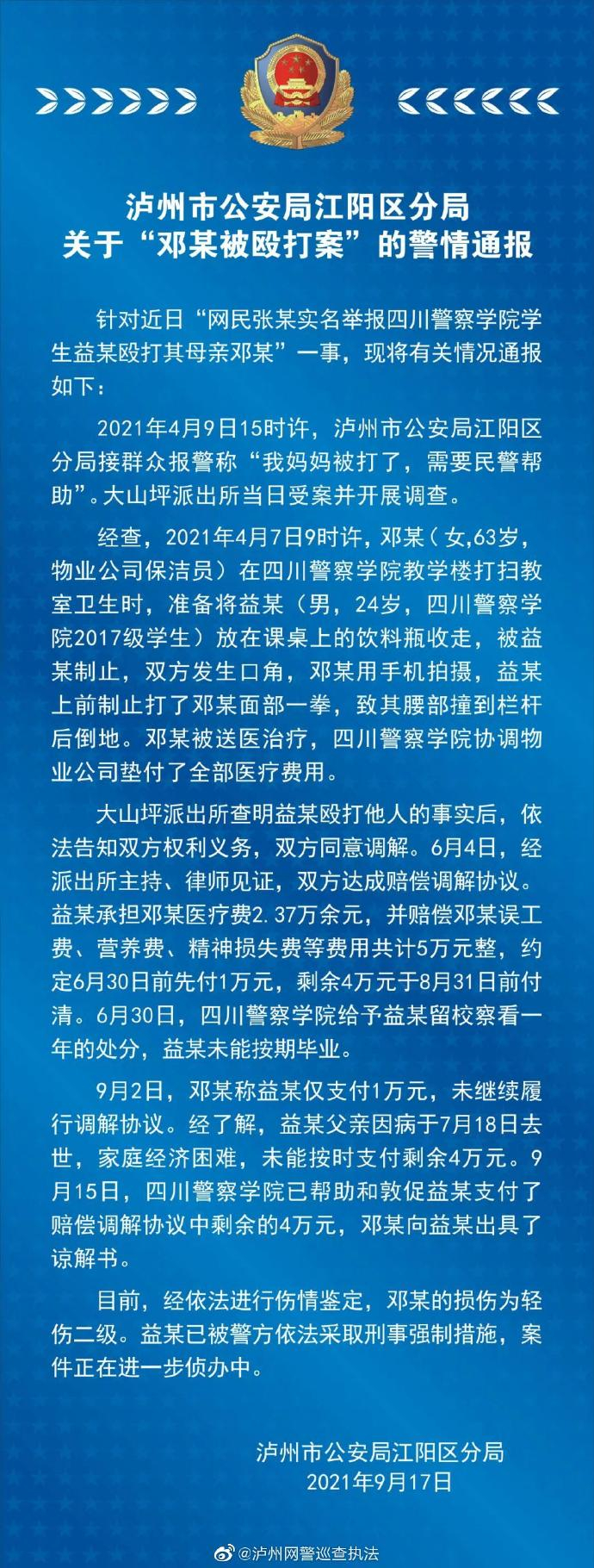 针对近日“网民张某实名举报四川警察学院学生益某殴打其母亲邓某”一事,现将有关情况通报如下: