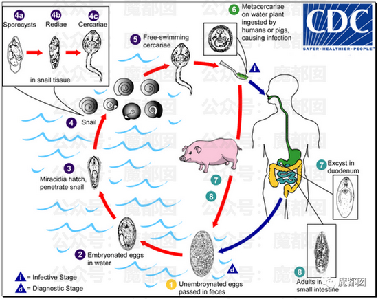 姜片虫的传染源是患者和猪,粪便里面含有虫卵,虫卵如果污染水源可以在水中发育成毛蚴,毛蚴遇到中间宿主扁卷螺之后可以进入到螺体,在扁卷螺体内发育成尾蚴,尾蚴再逸出螺体附着在水生植物,比如荸荠表面,在表面可以形成囊蚴。