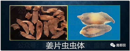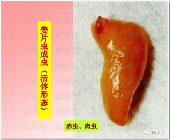姜片虫成虫扁平肥大,生活时呈肉红色,形似鲜姜之切片故得名。为寄生于人体的最大吸虫。