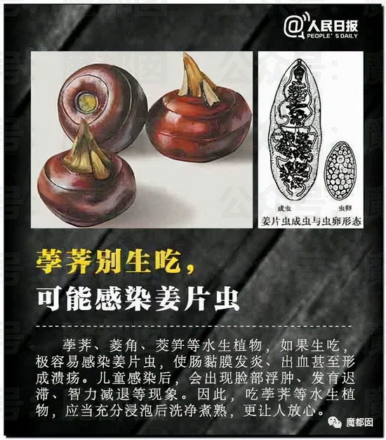 可能还有人会有侥幸心理,那么我直接生吃前削皮?我们反问一句,你怎么知道你削皮过程中姜片虫不会二次污染到荸荠内部?这个又不是成虫,看不到的,实在是没有必要为了这一口最终得不偿失。