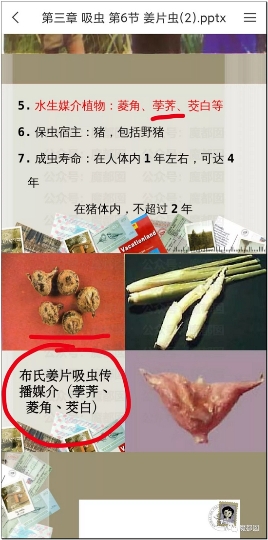 前面大家也看到了,这个姜片虫可以吸附在水生植物表明,那么显然,不止荸荠…还有什么?猜得到吗?
