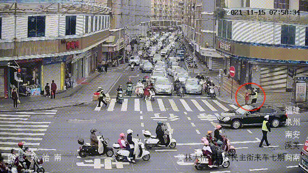 此时,南安市公安局交警大队城区中队副中队长吴浮金正在路口执勤,见到这一幕,他立即向老人喊话,“不要着急,我来帮您”。随后,吴浮金小跑着来到老人身边,柔声说道:“您慢点,我来帮你挑”,并一把接过老人手中的扁担。待绿灯亮起时,他呼叫一旁的同事,护送老人过马路,自己则挑着担子,快步穿过斑马线,将扁担平稳放到对面路口。