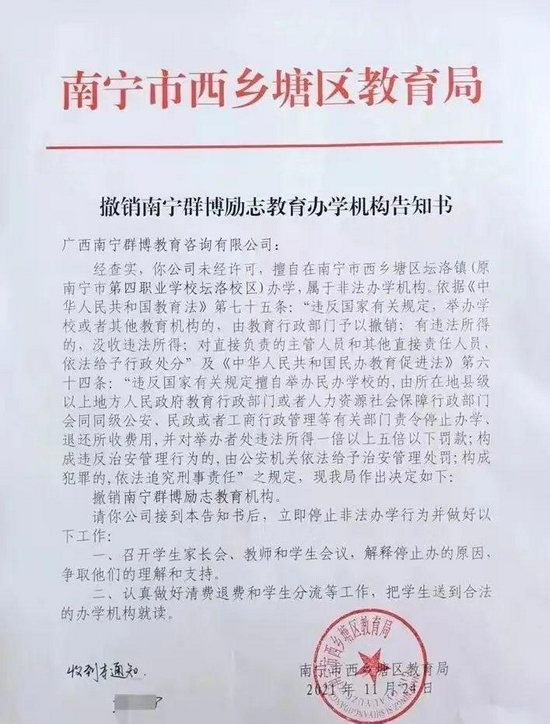2021年12月2日,新京报记者从南宁市西乡塘区教育局获悉,目前主管部门已下发撤销告知书,要求群博励志学校立刻停止非法办学行为,并做好学员遣散和安抚工作。案件中涉及违法的,将依法移交司法机关查处。