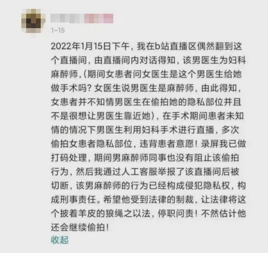 某医院麻醉师在1月15日偷拍女患者进行妇科手术现场直播,后被网友举报切断。