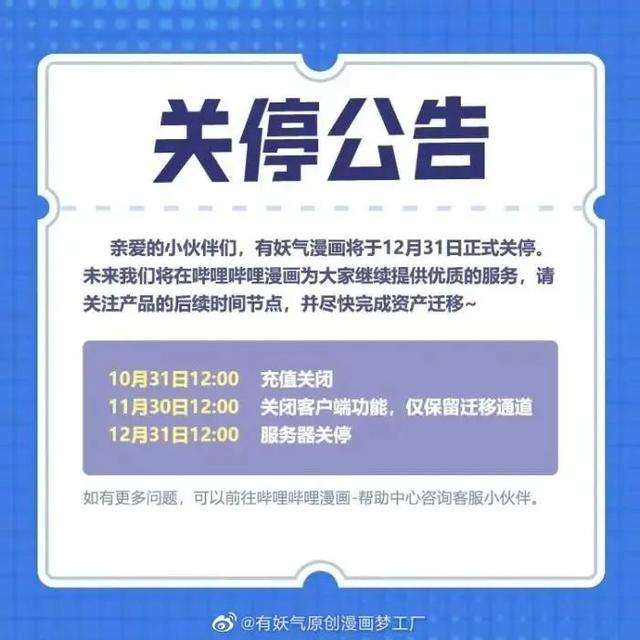 9月1日,有妖气原创漫画梦工厂微博发布公告称,将于12月31日正式关停。