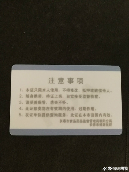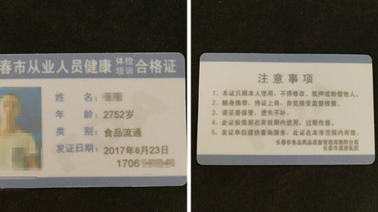 对此,记者致电长春市卫生和计划生育委员会,工作人员称,这两种证件是不一样的。“张先生办理的证件是由长春市食品药品监督管理局颁发的,是办理‘食品加工’许可所需的一个合格证,办理该证会有指定的医院体检,是收费的。而‘健康证明’是由卫生部门颁发的,两种证件是不一样的。”