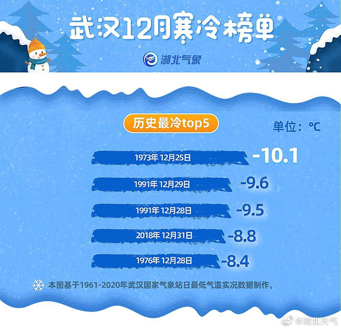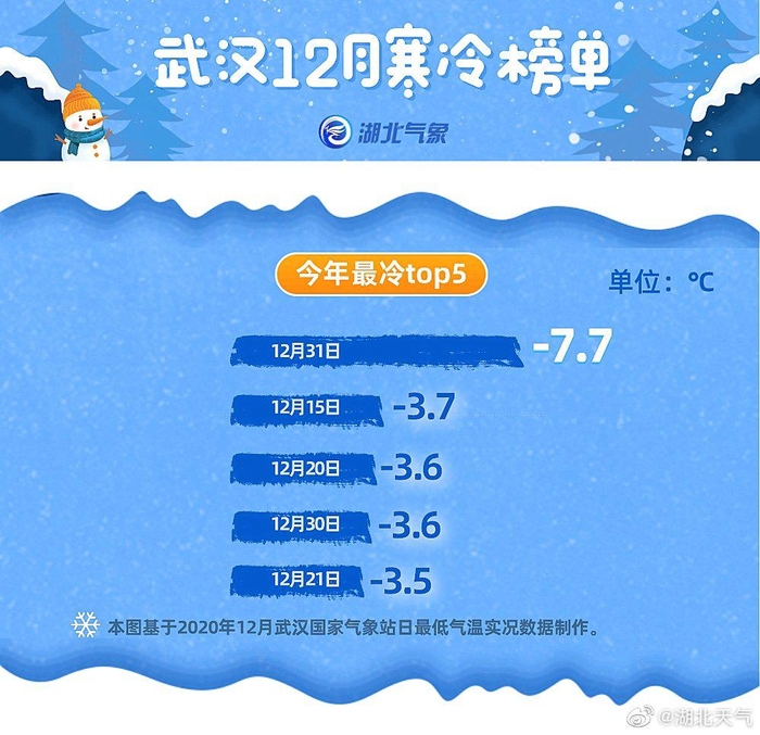 #武汉12月寒冷榜单# 今晨武汉的低温创今冬以来的新低:-7.7℃,但是你知道吗,这么低的气温居然还没有排到武汉12月历史最低气温的前五名。