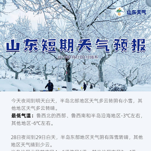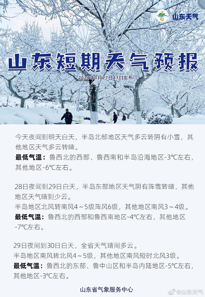 #山东天气#天气预报#今日(27日06-16时)全省最高气温为12.5℃。未来三天,大部地区天气较好,南北风交替,最大阵风6~7级,今夜到29日白天,半岛局部或有降雪天气。气温方面:明日最高气温明显下降,降至最低-1℃左右,29日起气温回升,提醒明晨外出请做好防风保暖