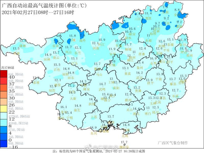 天气实况 广西气象 广西壮族自治区气象局 2021.02.2717:10 关注 #天气实况# 今天白天截至下午4点,全区最高气温均不超过20℃,最高的是东兴,只有18.9℃,最低的是乐业、南丹,仅为7.8℃!