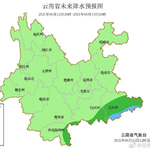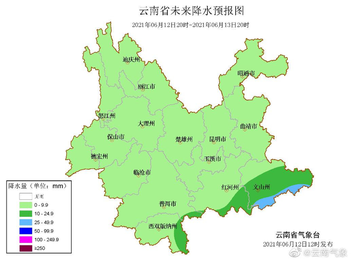 【云南省未来24小时天气预报】一、各地区天气预报 6月12日20时--6月13日20时:文山南部、红河南部多云间阴有中雨局部大雨,其它地区多云有阵雨局部中雨。 二、城市天气预报 保山:阵雨,19~29℃ 楚雄:阵雨,19~30℃ 大理:阵雨,16~29℃ 芒市:中雨,23~32℃ 香格里拉:阵雨,9~23℃ 蒙自:阵雨转大雨,20~29℃ 昆明:阵雨,17~26℃ 丽江:阵雨,16~28℃ 临沧:阵雨,19~30℃ 泸水:阵雨转中雨,22~33℃ 普洱:阵雨转中雨,21~30℃ 曲靖:阵雨,19~29℃ 文山:中雨,20~24℃ 景洪:中雨,24~35℃ 玉溪:阵雨,18~29℃ 昭通:阵雨,18~30℃