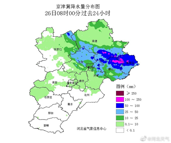 #降水实况# 【河北省气象台6月26日8时发布天气实况】25日8时-26日8时,张家口、承德、唐山、秦皇岛、保定中北部、雄安新区、廊坊、石家庄西北部、沧州北部出现降雨,降雨区平均降水量22.9毫米,张家口东北部、承德南部、唐山北部、秦皇岛有281个站点累计降水量超过50毫米(暴雨),其中承德南部、唐山北部、秦皇岛中西部有56个站点超过100毫米(大暴雨),滦平县井上村最大为142.8毫米(大暴雨),小时最大降水也出现在此地,为88.4毫米。25日下午到夜间张家口、承德、廊坊、唐山、秦皇岛有12个县(市)出现8级以上大风,瞬时风力康保最大为10级,沽源、崇礼、丰宁、玉田出现冰雹,沽源冰雹测站最大直径1.5厘米。
