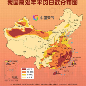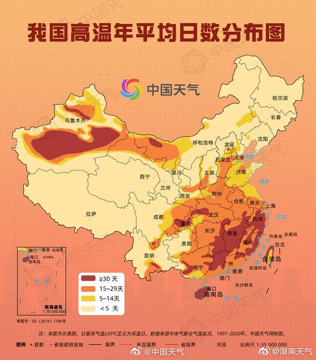 【#高温年平均日数分布图#出炉】气象上通常以日最高气温≥35℃为高温天气标准。中国天气统计显示,湘东湘南大部高温年平均日数大于30天,湘西湘北大部高温年平均日数约15~29天。#湖南高温超长待机# ,快来看看你在的地方高温日数有多少吧。via@中国天气