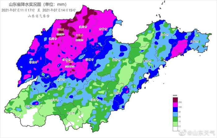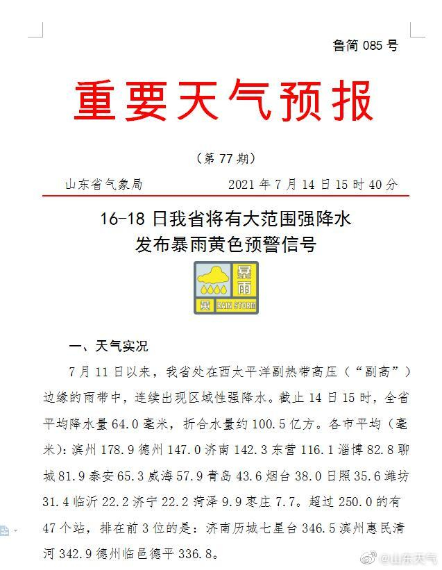#16-18日山东将迎大范围强降水#预计未来一周,山东仍处在副高边缘的雨带中,有连续的区域性强降水。其中,今夜到明天,德州、滨州、东营、济南、淄博和潍坊有大雨局部暴雨或大暴雨(25~50毫米局部100毫米以上),其他地区有中雨局部大雨或暴雨(10~25毫米局部50毫米以上)。16-18日,有明显的冷暖空气在我省交汇,将有大范围强降水,伴有雷电和8~10级局部11级以上雷雨阵风,全省平均降水量80~120毫米,菏泽、济宁、泰安、济南南部、淄博南部、枣庄和临沂西部降水量在100毫米以上,局部降水量可超过300毫米,最大小时雨强50~80毫米。为此,山东省气象台于2021年7月14日15时40分发布暴雨黄色预警信号。 前期我省降雨过程频繁,未来降水仍然强度大、范围广,部分区域与前期强降水重叠,降水极端性明显,建议提前做好防范应对工作。 鉴于目前天气形势复杂极端,预报具有不确定性,气象部门将严密监视天气变化,及时做好滚动更新,请关注最新天气预报预警。#山东暴雨#