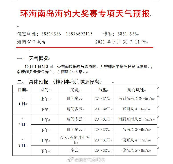 09月30日09时环海南岛海钓大奖赛专项天气预报 海南气象服务 2021.09.3009:42 关注 【环海南岛海钓大奖赛专项天气预报】预计,10月1日到3日,受东南转偏东气流影响,万宁神州半岛洲仔岛海域附近,以晴间多云天气为主,东南风3~5级。具体预报如下: