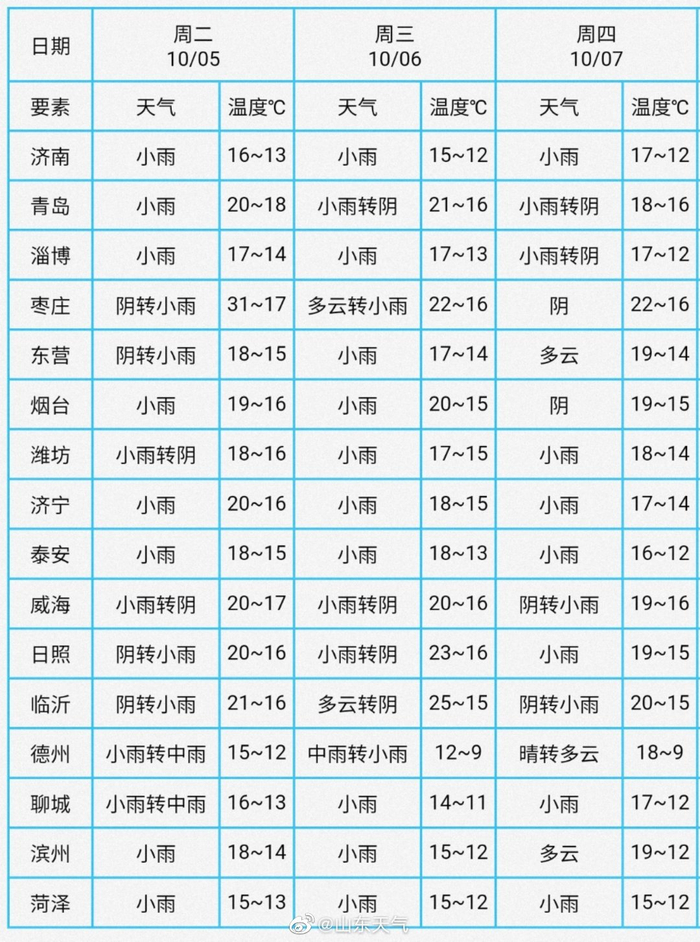 #山东天气# 【山东未来三天秋雨添凉意 最低气温将现个位数】预计今明两天,我省仍有降雨,鲁西北地区有中雨局部大雨;7日部分地区有小雨。