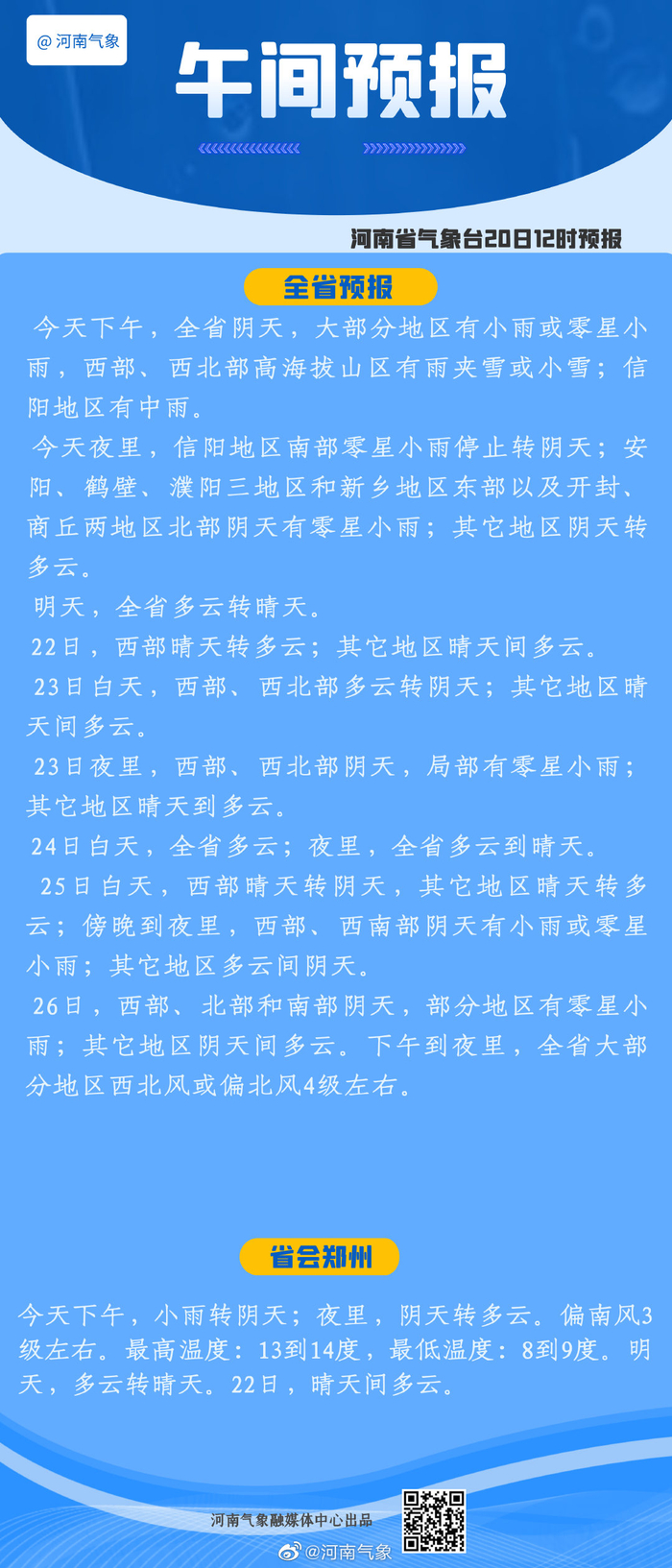 今天下午,全省大部地区有小雨或零星小雨,西部、西北部高海拔山区有雨夹雪或小雪;信阳地区有中雨。今天夜里,信阳地区南部零星小雨停止转阴天;安阳、鹤壁、濮阳三地区和新乡地区东部以及开封、商丘两地区北部阴天有零星小雨;其它地区阴天转多云。