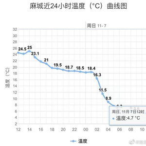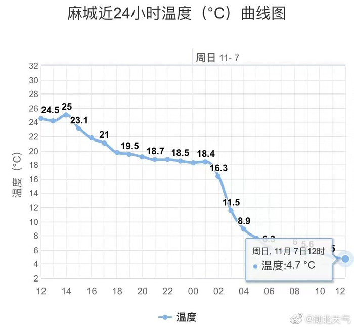 麻城的朋友,你们还好吗?相比昨天中午12时的气温24.5℃,今天只 湖北天气 2021.11.0712:55 关注 麻城的朋友,你们还好吗?相比昨天中午12时的气温24.5℃,今天只有4.7℃,24小时近20℃的降幅,你们感受强烈吗?