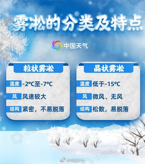 雾凇的形态有粒状和晶状之分。中国天气网气象分析师王伟跃介绍,其中粒状雾凇由过冷却的雾滴被风吹过细长的物体时,与物体接触迅速冻结而形成,风在其形成过程中起到关键作用;而晶状雾凇主要是低温环境下水汽的凝结过程,需要所处环境低于-15℃。