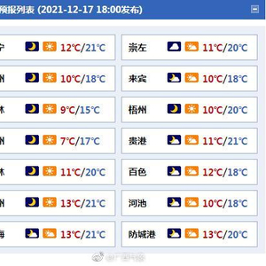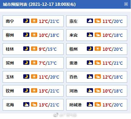 #广西天气# 【明后天继续降温!19日早晨迎降温过程最低点!一周内大部地区继续“无雨”!】两天内,全区多云到晴,桂北和高寒山区局部有霜冻或冰冻。沿海地区有6级,阵风7~8级偏北风。各地最低气温:高寒山区零下5~2℃,桂北3~7℃,桂南7~14℃。受冷空气影响,各地气温继续下降4~6℃,局部8℃以上。 森林火险气象等级:桂西北4级,高火险;其它地区5级,极高火险。 南宁市:今天晚上到明天白天,晴天,东北风3级,最低气温12℃,最高气温21℃。 20-21日,全区阴天到多云,桂东南和沿海局部有小雨。高寒山区局部有霜冻或冰冻。各地气温缓慢回升。各地最低气温:高寒山区零下2~3℃,桂北4~8℃,桂南9~15℃。 22日,全区多云到晴。各地最低气温:高寒山区1~6℃,桂北7~12℃,桂南12~17℃。 23-24日,全区多云到阴天,其中桂北、桂东局部有小雨。各地最低气温:桂东北6~11℃,其它地区12~18℃。