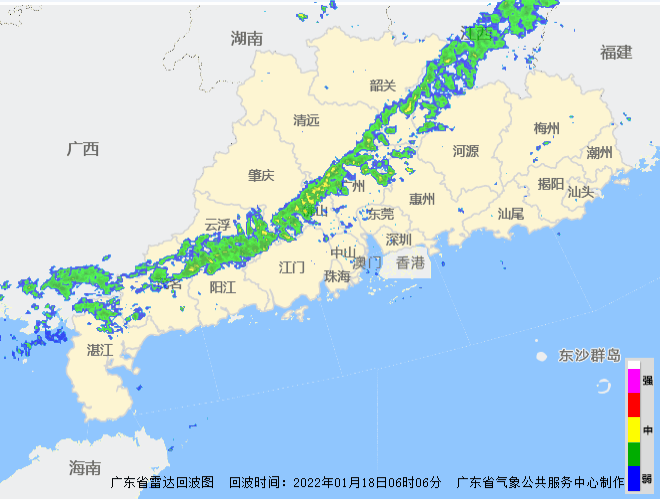 【#广东天气追踪#降雨减弱】今天(1月18日)11时,影响广东的雨带逐渐消散,只剩梅州、茂名、阳江等地有一些弱降水(基本录不到雨量),中午出去吃饭可以不带伞。不过有点北风,加上没阳光,体感有点阴冷,要注意保暖。#2022广东春运天气# #春运这些天#