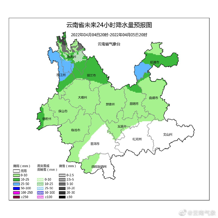 【云南省未来24小时天气预报】 一、各地区天气预报 04月04日20时到04月05日20时:怒江中北部阴有大雨,迪庆阴有大雪局部暴雨,怒江南部、丽江、昭通南部、曲靖北部、昆明北部、德宏西部阴有中雨,文山、红河、西双版纳东部多云间晴,其它地区阴天间多云有小雨。 二、城市天气预报 保山:小雨,12~20℃ 楚雄:小雨,11~19℃ 大理:小雨,12~19℃ 芒市:小雨,17~26℃ 香格里拉:大雪,-2~6℃ 蒙自:晴转阴,11~20℃ 昆明:阴转小雨,9~16℃ 丽江:中雨,8~14℃ 临沧:小雨,13~24℃ 泸水:中雨,16~20℃ 普洱:晴转多云,13~26℃ 曲靖:小雨,7~15℃ 文山:晴转阴,7~22℃ 景洪:晴转多云,17~30℃ 玉溪:小雨,9~19℃ 昭通:中雨,4~11℃