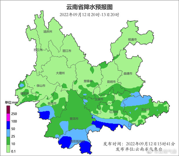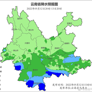 【云南省未来24小时天气预报】 一、各地区天气预报 09月12日20时-09月13日20时:曲靖南部、昆明南部、楚雄南部、玉溪、文山、红河、普洱、西双版纳、临沧、德宏阴有中雨局部大雨、暴雨,其它地区多云有阵雨局部中雨。 二、城市天气预报 保山:小雨,17~27℃ 楚雄:小雨,16~24℃ 大理:小雨,15~22℃ 芒市:小雨,21~29℃ 香格里拉:小雨,7~20℃ 蒙自:小雨,19~25℃ 昆明:中雨转阵雨,15~20℃ 丽江:阵雨转小雨,13~22℃ 临沧:小雨转中雨,18~25℃ 泸水:小雨,21~32℃ 普洱:中雨转小雨,19~24℃ 曲靖:小雨,16~25℃ 文山:小雨转中雨,18~25℃ 景洪:中雨,23~28℃ 玉溪:小雨,16~22℃ 昭通:小雨,15~25℃