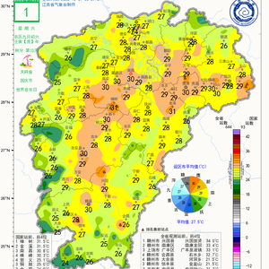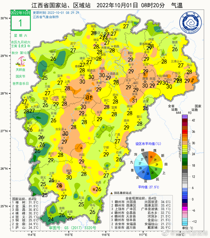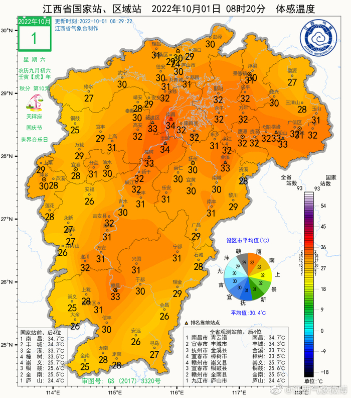 江西天气 江西气象微博 2022.10.0108:40 关注 #江西天气# 上午8点,全省气温平均27.5℃,体感温度平均为30.4℃。预计今天全省最高气温36~38℃。晴热高温天气,外出应注意防暑防晒,多补充水分。