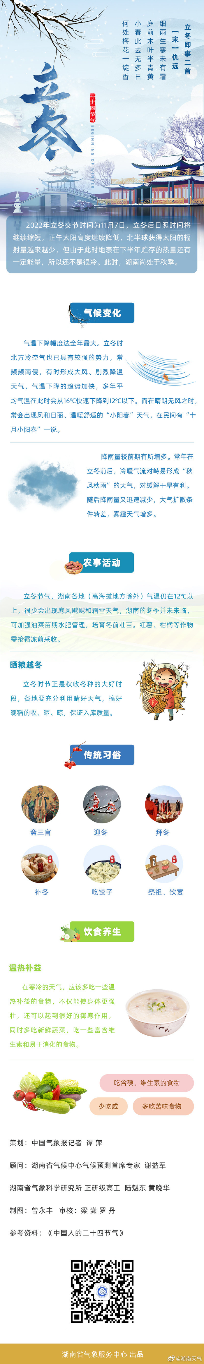 图解二十四节气之立冬 湖南天气 2022.11.0709:17 关注 【图解二十四节气之立冬】2022年立冬交节时间为11月7日,立冬后日照时间将继续缩短,正午太阳高度继续降低,北半球获得太阳的辐射量越来越少,但由于此时地表在下半年贮存的热量还有一定能量,所以还不是很冷。