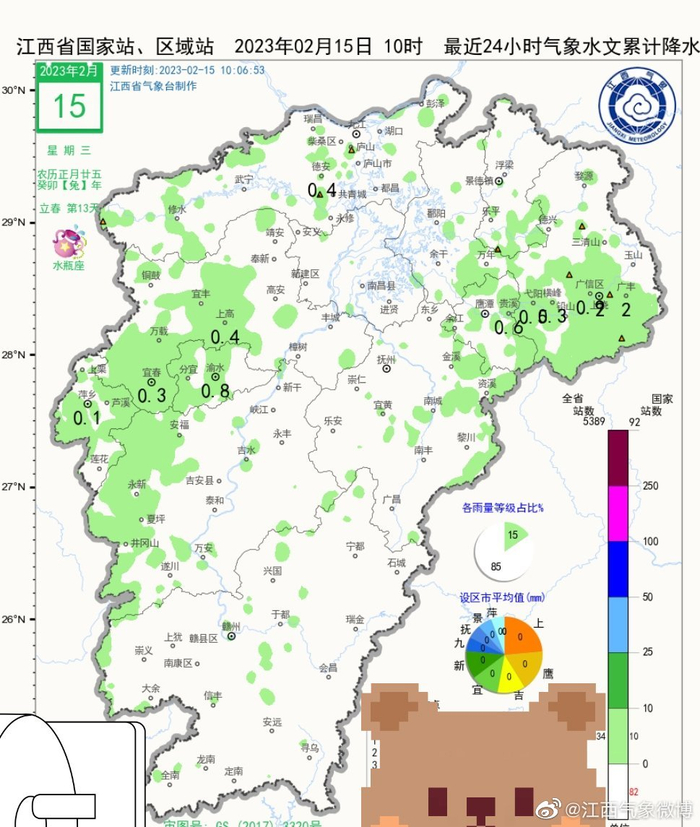 江西天气雨情速报 江西气象微博 2023.02.1510:18 关注 #江西天气雨情速报# 2月14日9时至15日9时,全省雨水活动减弱,降雨量仅以九江庐山市植物园8毫米为最大,景德镇乐平市白土峰7毫米次之。#未来三天江西晴天为主# ,全省全面放晴,气温回升。