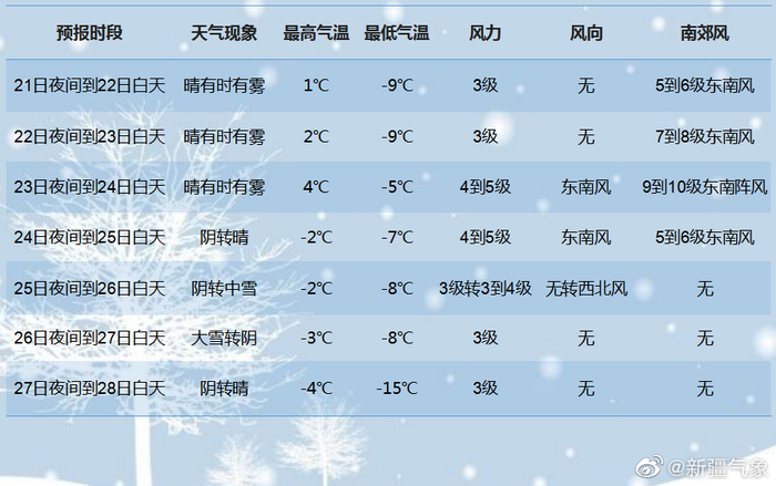 【乌鲁木齐七天天气预报】乌鲁木齐21日夜间到22日白天:城区晴有时有雾,气温1到-9度,风力3级,南郊有5到6级东南风。气温有所回升,外出注意远离建筑边缘,谨防坠冰危险,出行请关注最新临近预报预警信息。