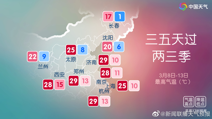 8-13日,北方至长江中下游等地气温起伏大,多地最高气温最高值、最低值将相差15℃左右 新闻联播天气预报 2023.03.0713:52 关注 8-13日,北方至长江中下游等地气温起伏大,多地最高气温最高值、最低值将相差15℃左右。
