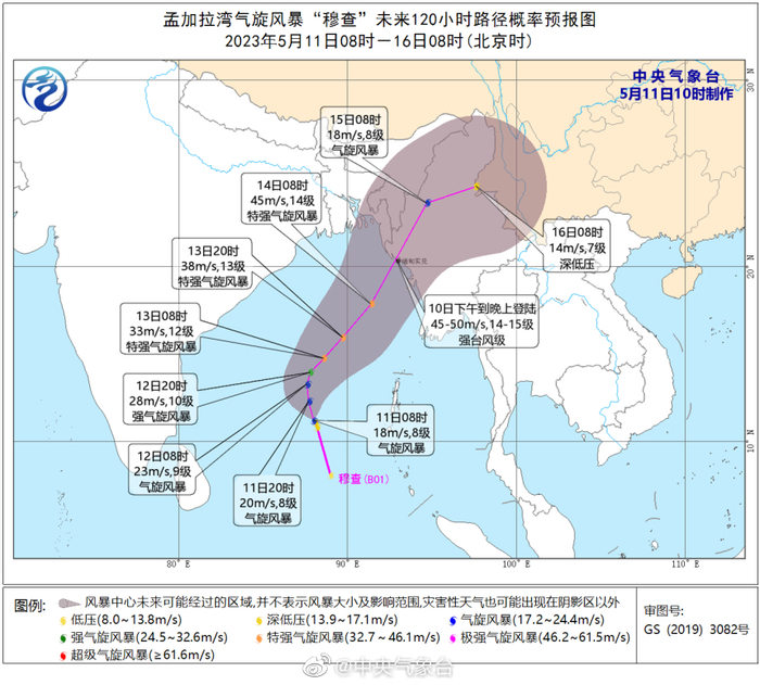 #北印度洋今年首个气旋风暴“穆查”生成# 孟加拉湾气旋风暴“穆查”(MOCHA)已于今天上午(11日,北京时)在孟加拉湾南部海面上生成,上午08时其中心位于距离缅甸实兑南偏西方向约1130公里的洋面上(北纬11.2度、东经88.0度),中心附近最大风力有8级(18米/秒,相当于我国的热带风暴级)。 预计,“穆查”将以每小时10公里左右的速度向北偏西方向移动,强度逐渐加强,12日转向东北方向移动,最强可达15-16级(48-55m/s,相当于我国的强台风级或超强台风级),14日下午到晚上将在缅甸西北部到孟加拉国东部一带沿海登陆(14-15级,强台风级),以后迅速减弱。#萌台报天气#