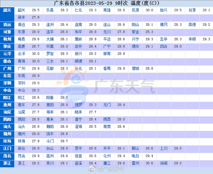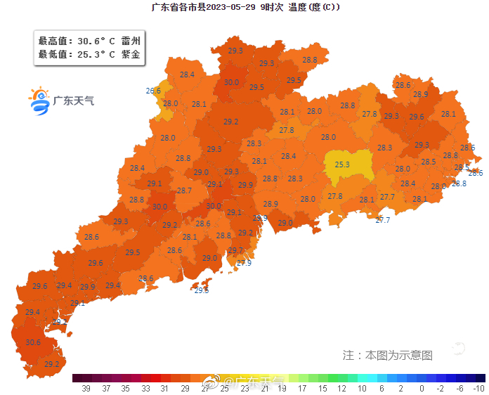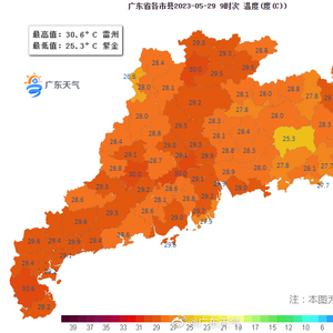 【“鸡腿”颜色渐深】早晨9点,广东晴为主的天气,气温继续上升,最高气温已接近31℃,中午前后体感偏热,要注意防暑防晒。 整点气温排名:云浮30、佛山30、广州29.9、茂名29.9、梅州29.6、韶关29.5、清远29.3、中山29.2、湛江29.2、深圳29、东莞28.9、汕头28.8、潮州28.8、江门28.8、肇庆28.7、阳江28.6、揭阳28.5、河源28、珠海27.9、惠州27.8、汕尾27.7(单位:℃)#广东气温实况##5月底广东一键快进到高温天#