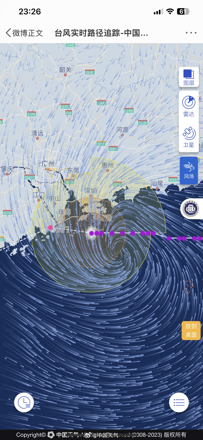#台风苏拉把广东海岸线描了一遍#描边大师超强台风苏拉无限接近中。23时,台风“苏拉”距离广东省珠海市东偏南方向约60公里,16级,52米/秒。“苏拉”将以每小时15公里左右的速度向偏西方向移动,强度逐渐减弱。广东的小伙伴,你那里的风雨大吗? #深圳台风##台风路径#