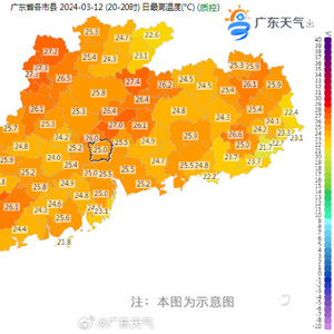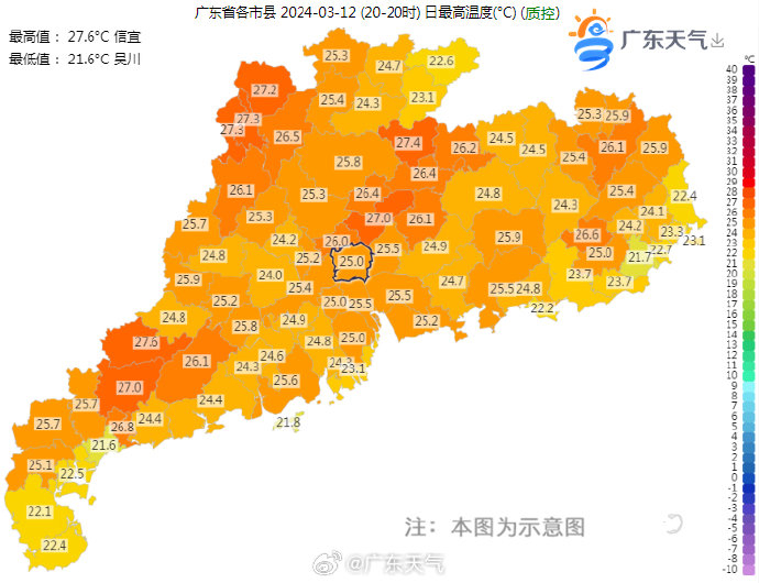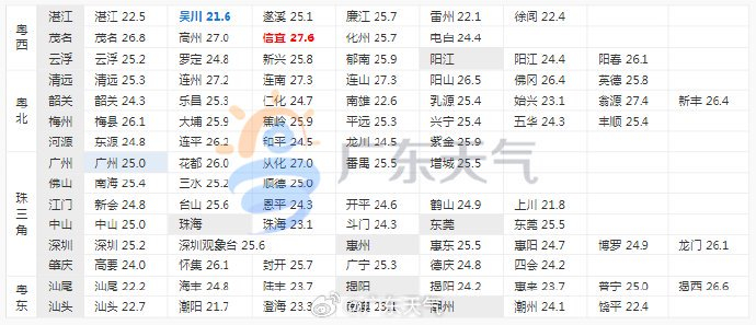 #广东气温实况#今天(12日)在阳光的助力下,气温一路往上冲,拿下全省最高气温的信宜达到27.6℃。明天阴雨重新上线,大家出门前可以打开weixin小程序缤纷微天气了解最新预报,及时调整着装和携带雨具。#广东天气小孩式变脸# #周二广东放晴抓紧洗晒# 全省市级最高气温排名如下:茂名26.8、梅州26.1、惠东25.5、东莞25.5、佛山25.4、清远25.3、云浮25.2、深圳25.2、广州25.0、中山25.0、江门24.8、河源24.8、阳江24.4、韶关24.3、揭阳24.2、潮州24.1、肇庆24.0、珠海23.1、汕头22.7、湛江22.5、汕尾22.2(单位℃)。