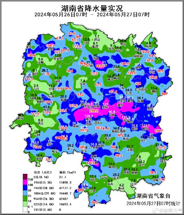 #湖南天气实况# 监测显示,昨天(26日)07时至今天07时,全省14市州91个县(市、区)594个乡(镇)出现暴雨,13市州44个县(市、区)136个乡(镇)出现大暴雨,其中邵阳、湘潭2市州2个县(市、区)出现特大暴雨,最大为新邵潭溪镇258.2毫米(创该县历史极值)(图1),最大小时雨强为芷江县芷江镇94.8毫米(26日18时至19时);7市(州)15县(市、区)极大风速超过8级,最大为桑植官地坪镇22.7米/秒(9级);最高气温湘西、湘南30~32℃,其他地区33~35℃,13站出现大于35℃高温;最低气温22~24℃。