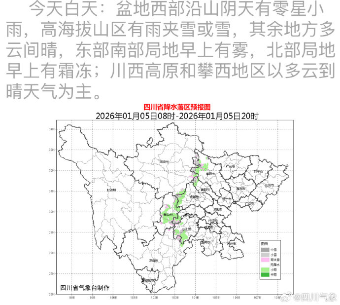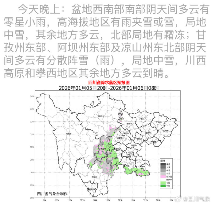 #早安[超话]##四川省早间天气预报# 今天白天到晚上:盆地西南部南部阴天间多云有零星小雨,高海拔地区有雨夹雪或雪,局地中雪,其余地方多云间晴,东部南部局地早上有雾,北部局地早上有霜冻;甘孜州东部、阿坝州东部及凉山州东北部阴天间多云有分散阵雪(雨),局地中雪,川西高原和攀西地区其余地方多云到晴。24小时内,盆地最低气温:北部-1~2℃,其余地方2~5℃,最高气温:11~13℃。