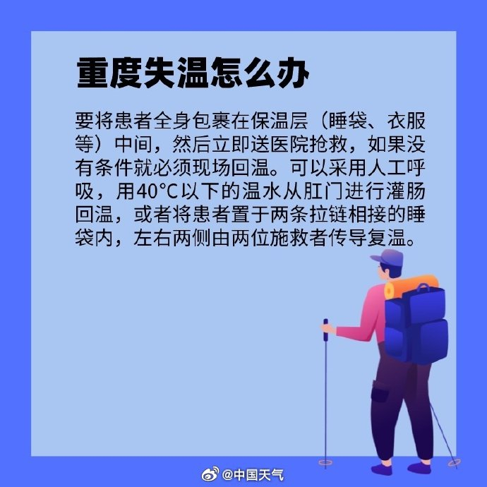 #违规穿鳌太线获救男子失温产生幻觉# 近日,秦岭“鳌太线”发生5人违规穿越事件引发关注。当地相关部门多次提醒,鳌山区域部分地段属于自然保护区,违规穿越危险性极大,请大家遵规守法,敬畏自然,珍爱生命。 如果遇到“失温”该怎么办?#晚红的随机科普# 据国家应急指挥广播消息称,失温可分为轻度失温和重度失温。 轻度失温时:患者体温下降到33~35℃,同时会产生剧烈的寒战、四肢冰凉、脸色苍白、严重疲劳、语言不清、肌肉不受意识控制、呆滞、记忆力减退、情绪改变或者失去理智、脉搏减缓、幻觉等。 重度失温时:患者体温降到32℃以下,并且失去意识,进入类似冬眠的状态。具体表现为肌肉不再痉挛、脉搏和呼吸速度放慢、体表血液循环大幅度下降、丧失意识等。 在寒冷天气里,失温是户外活动中发生致死事故的重要原因,而这个问题却又常常被忽略,那么,万一不幸遇到失温的情况,该如何应对? 当出现轻度失温时,首先要保持体力,停止活动或紧急扎营,尽快脱离低温恶劣环境,及时脱下汗湿衣物,更换保暖衣物,为防止继续失温,可进食热糖水重获体温。 当出现重度失温时,要将患者全身包裹在保温层(睡袋、衣服等)中间,然后立即送医院抢救,如果没有条件就必须现场回温。可以采用人工呼吸,用40℃以下的温水从肛门进行灌肠回温,或者将患者置于两条拉链相接的睡袋内,左右两侧由两位施救者传导复温。