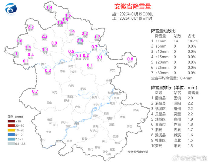 #安徽省天气快报##安徽沿江江北大雪局部暴雪##雨雪降温齐袭安徽# 【天气实况】过程累计降雪量:1月18日17时-19日11时,沿淮淮河以北和大别山区北部有降雪,较强降雪主要出现在阜阳、亳州、蚌埠、宿州,最大降雪量4.2毫米。 1月19日08时-11时,沿淮淮河以北和大别山区北部有降雪,较强降雪主要出现在阜阳、亳州、蚌埠、宿州,最大降雪量2.9毫米。 1月19日11时积雪深度:宿州、淮北、亳州、阜阳、蚌埠出现积雪,最大积雪深度出现在砀山、萧县和宿州(2厘米)。 【未来3小时天气预报】预计1月19日11时-14时,阜阳、亳州、宿州、淮北、蚌埠、淮南、六安、合肥北部、滁州北部有降雪,降雪量1毫米左右。