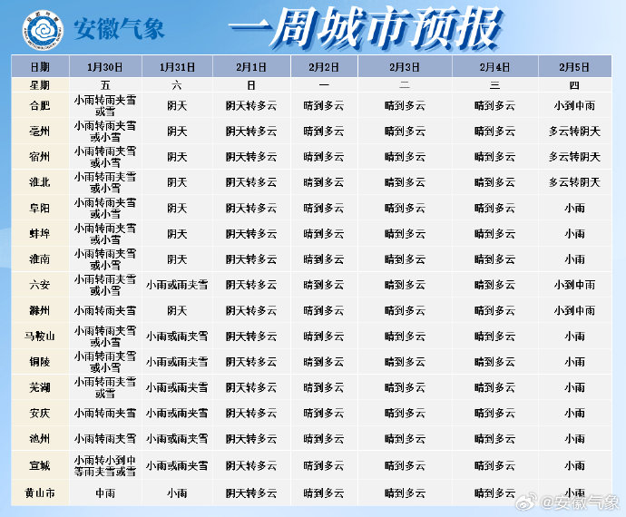 #安徽省天气预报#【天气周报】降水:今明两天我省雨雪天气持续,其中30日大别山区和江南部分地区有中雪,局部大雪;31日大别山区有小雪,江南部分地区有小到中雪。此外,5日全省大部分地区有小雨,其中江淮之间部分地区中雨。其余时段全省以晴到多云天气为主。 气温:受弱冷空气影响,今明两天全省大部分地区平均气温将下降3~5℃,同时今天全省平均风力3~4级,阵风7级。冷空气过后,2月1日早晨我省最低气温:淮河以北和本省山区-4~-2℃;江南南部0~2℃;其他地区-3~-1℃。2月4日前全省气温将逐渐回升,4日淮河以北、江淮之间北部最高气温15~17℃,其他地区17~20℃。#安徽雨雪天气接力刷屏##大范围雨雪覆盖十余省份#