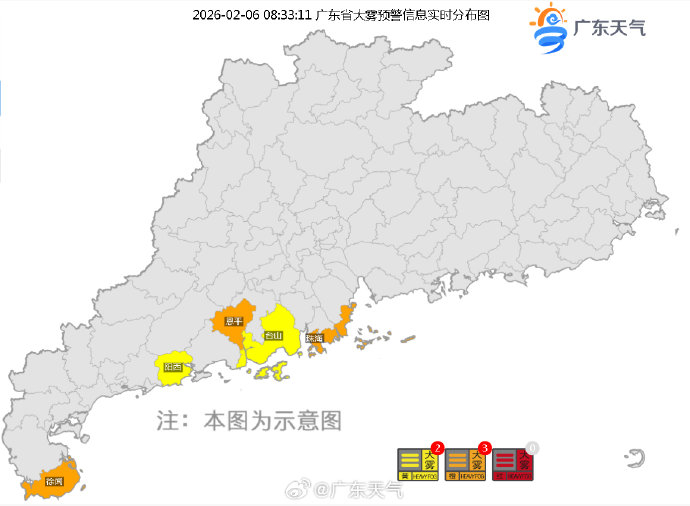 广东预警实况 广东天气 02.0608:37 关注 #广东预警实况#截至8:33,徐闻、恩平、珠海大雾橙色预警生效,阳西、台山大雾黄色预警生效中,行车遇到能见度低路段应及时打开雾灯,出行多注意交通安全!#广东冷空气又双叒叕周末来#
