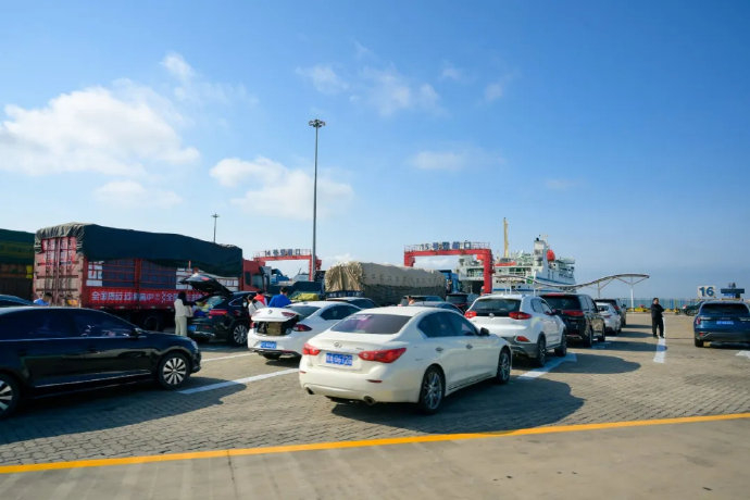 图8:2月7日10时,随着天气好转,往来轮渡逐渐频繁,过往车辆在登船口排队等待。图/罗圣茗