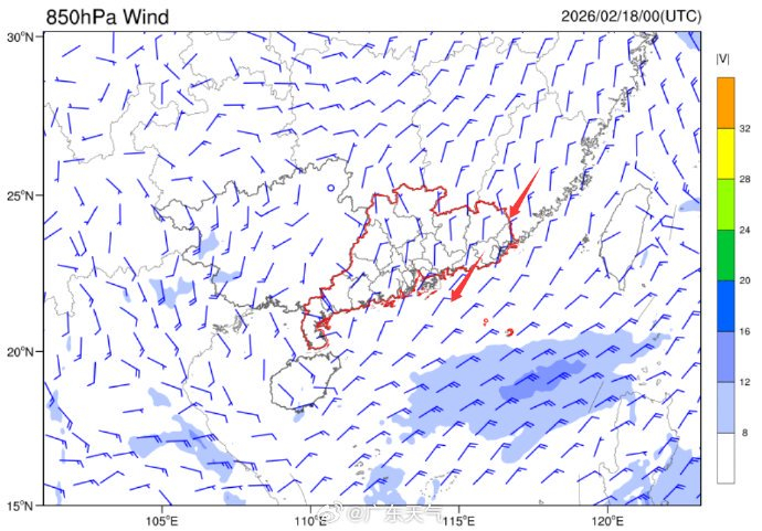 【#广东天气剧透# 】目前,中等强度冷空气已抵达南岭,白天将在南岭堆积影响粤北,夜间抵达广州。,过程最低气温或出现在18日或19日。 星星17日(初一),925百帕转为偏北风,850百帕冷垫上暖湿气流爬升,粤西、珠三角以西转受偏南风影响,有分散性降水。 星星18日(初二),低层转为一致的偏北风控制,云量仍较多,降水不明显。粤西能见度较差。 星星19日(初三)起,除粤北以外,其他地区天况渐转好。 #一股实力不俗的冷空气已登场# #2026广东暖心春运天气#