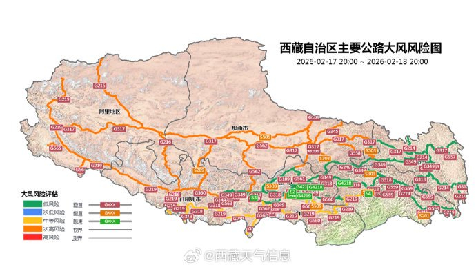 #春运公路预报# 受小雪天气影响的路段有:564国道普兰段。受大风天气影响的路段有:109国道安多至当雄段、317国道革吉至巴青段、216国道措勤段、345国道聂荣段。 建议:未来24小时,阿里、那曲西部、日喀则西部和昌都北部地方有阵雪,同时受前期降水天气影响林芝部分国道沿线道路结冰风险较高,需防范雨雪天气对交通运输带来的不利影响,提请过往司乘人员做好车辆的防滑措施;那曲、阿里、山南南部、日喀则西部和南部有7级左右大风,沿雅鲁藏布江一线有5级左右阵风。需防范风吹雪天气对交通运输带来的不利影响,谨慎驾驶,确保交通安全。